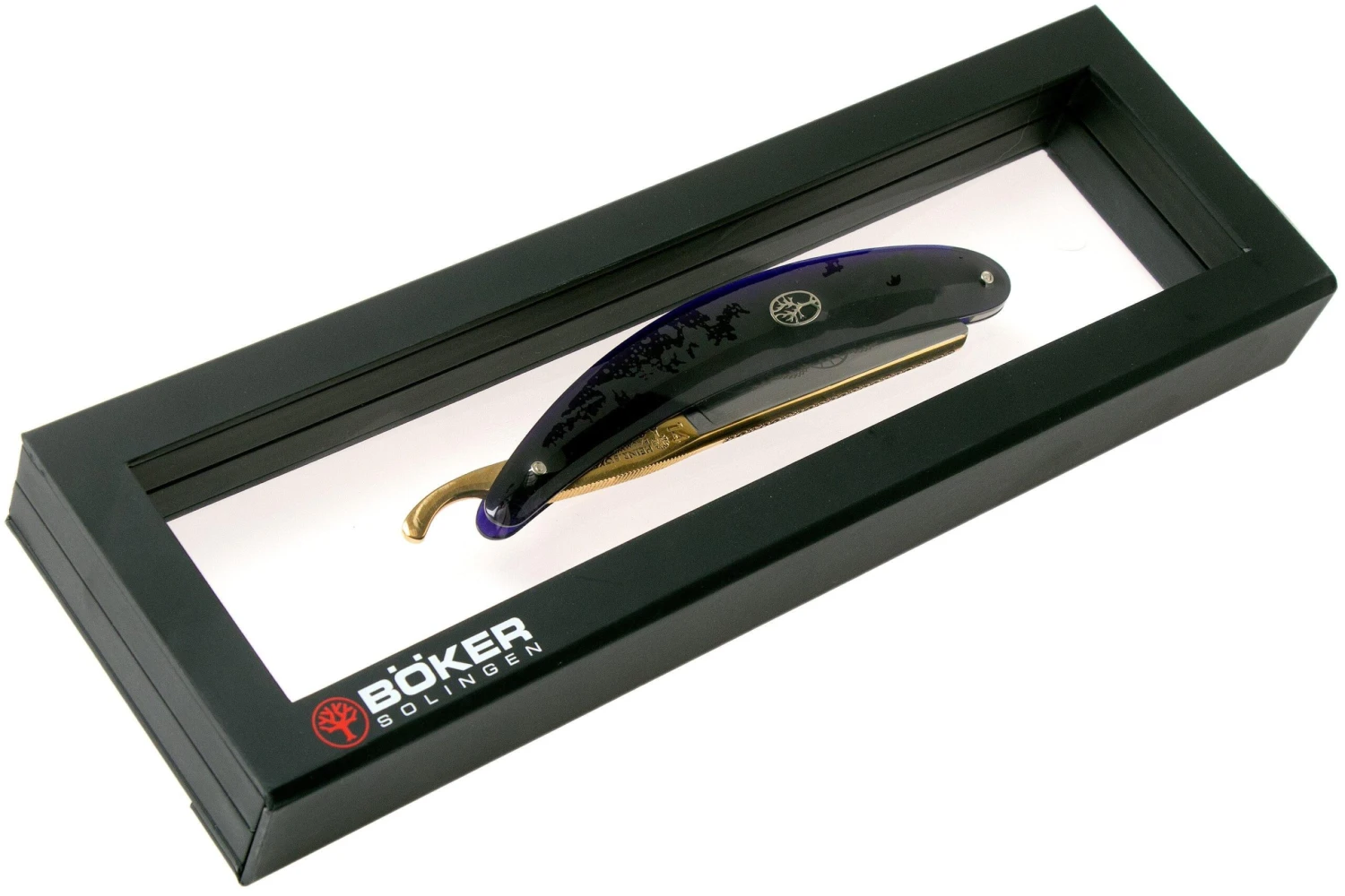 Le Böker Manufaktur 14er 140800 est un rasoir coupe-choux de la plus haute qualité. C’est la première fois depuis des décennies, voire même un siècle, que Böker sort un rasoir coupe-choux avec une hauteur de 8/8″. C’est très haut ! Autrefois, on appelait justement ce type de rasoirs « 14er », d’où le nom de ce modèle. La soie est partiellement gravée en doré.