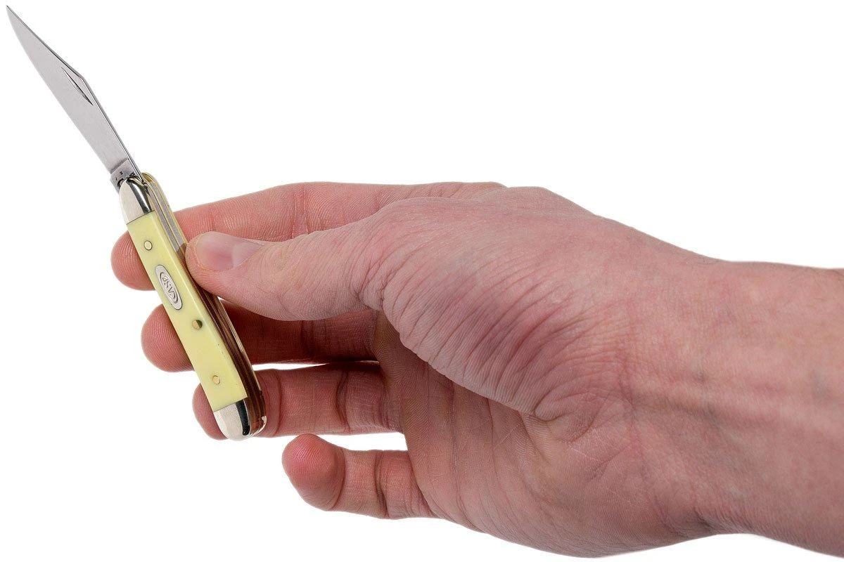 Le Case Peanut est un couteau de poche traditionnel en forme classique de cacahuète. Ce motif tire son nom de la forme du manche : avec un peu d’imagination, il ressemble à la pelure d’une arachide. Il s’agit d’un couteau relativement petit avec deux lames : une lame principale clippoint et une lame secondaire en forme de stylo. Les deux lames ont une pointe légèrement différente. Vous pouvez les utiliser pour différentes tâches, ou vous pouvez les inter changer lorsque l’une d’entre-elles est émoussée. Elles sont toutes les deux maintenues en position ouverte par un slipjoint.