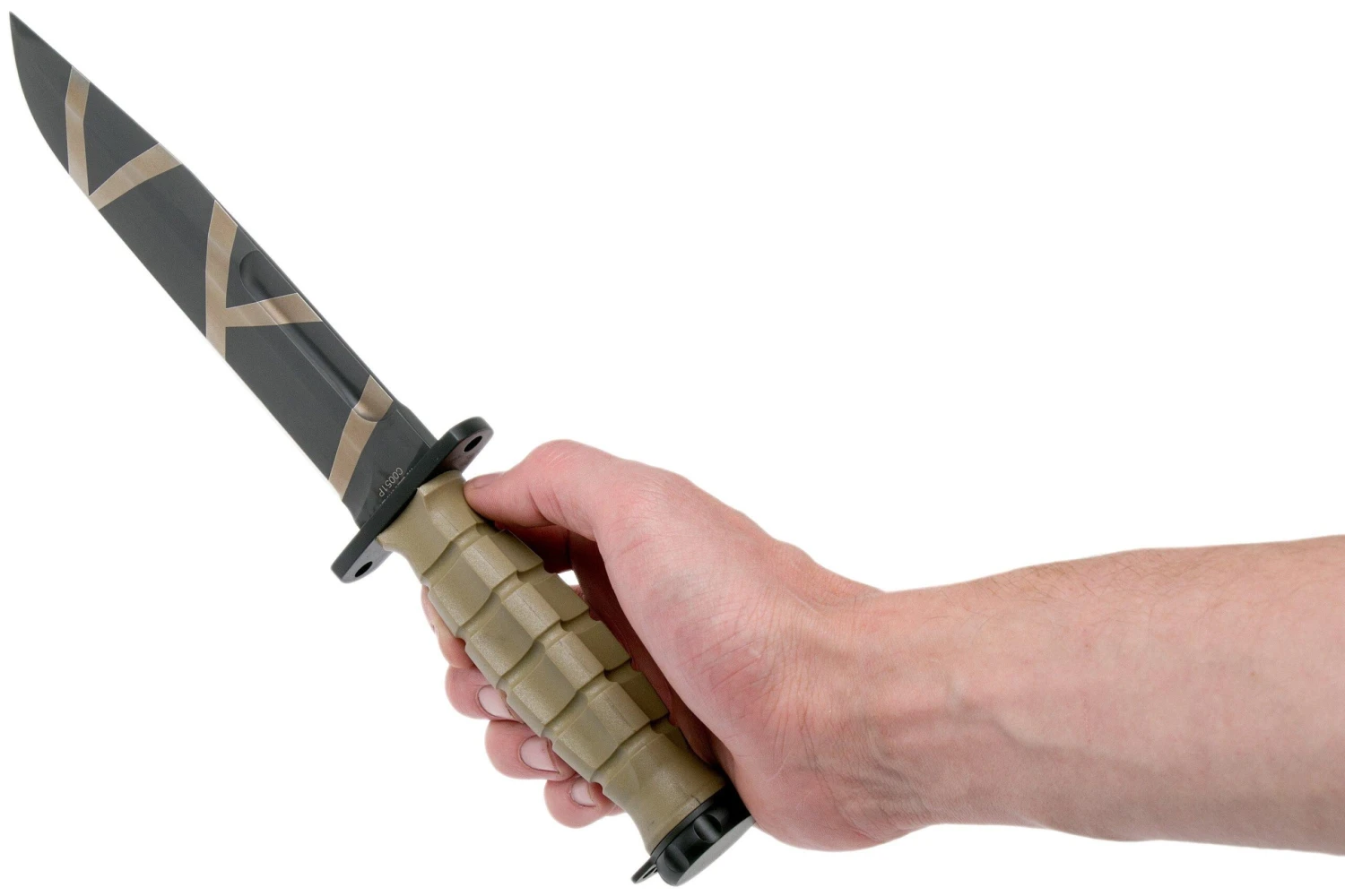 Couteau-poignard tactique robuste, en acier Böhler N690 (58 HRC). Longueur lame 18 cm. Manche en nylon qui résiste à l’usure. Le couteau légendaire MARK 2, utilisé fréquemment pendant la Seconde Guerre mondiale, a servi comme exemple pour ce modèle. Le couteau est livré avec un étui HCS coyote, spécialement développé pour les unités des forces d’opérations spéciales.
