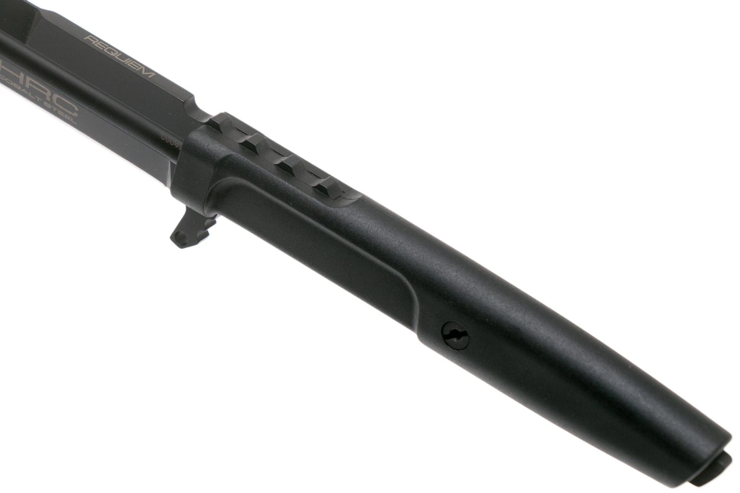 L’ Extrema Ratio Requiem est un couteau fixe fin qui rappelle la stiletto italienne. Son design fin permet de le porter en toute discrétion. Avec un poids d’à peine 85 grammes, c’est l’un des modèles les plus légers chez Extrema Ratio. Le manche n’est pas fixé via des vis sur le côté, comme chez la plupart des couteaux fixes, mais avec une seule vis au bout.