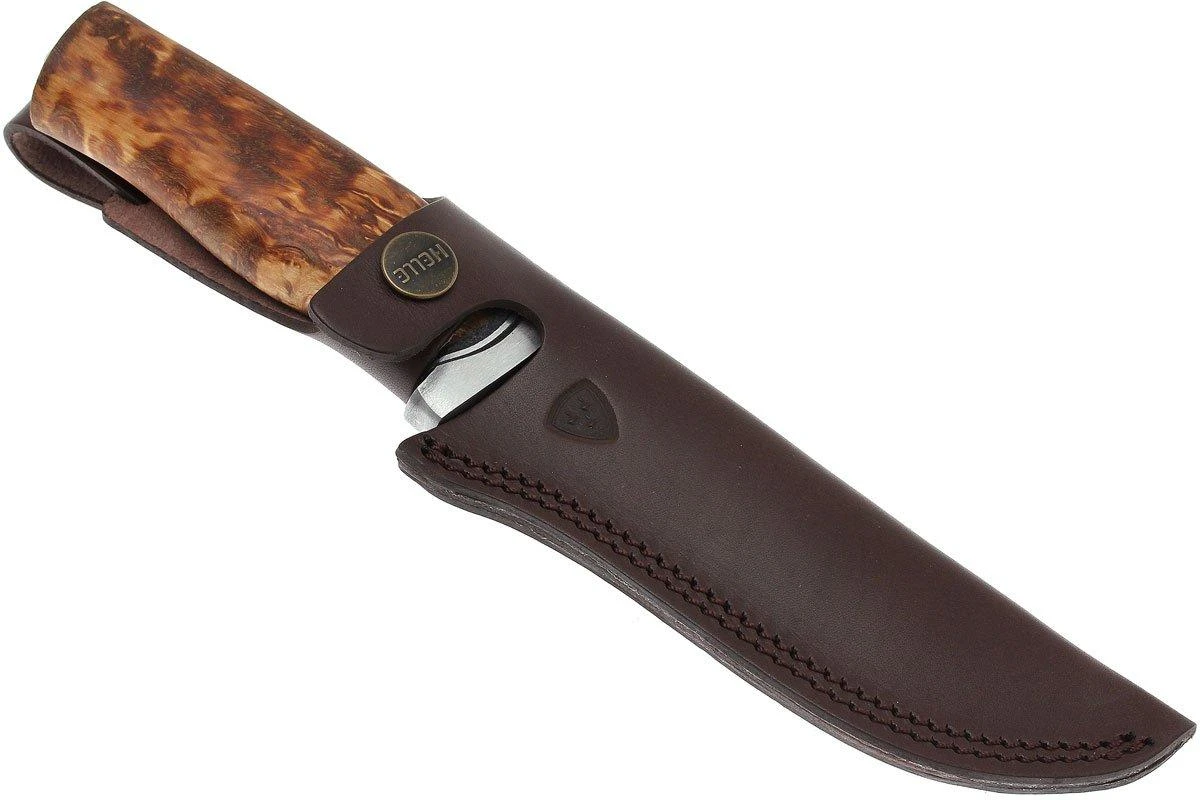 Le Helle GT 36 est l’un des plus grands couteaux de la gamme Helle. Néanmoins, le poids dû à la coque en aluminium et à l’absence de garde est relativement faible. Cette mitre en aluminium offre non seulement un soutien supplémentaire pendant l’utilisation, mais aussi une sécurité supplémentaire pour vos doigts. Le manche est fait de bois de bouleau ondulé. Formé à la main, poli et huilé pour donner au manche son caractère unique. La lame est en full-tang, ce qui signifie que l’acier continue jusqu’à l’extrémité du manche. En ce qui concerne l’acier, le choix s’est porté sur l’acier carbone laminé 3 couches.