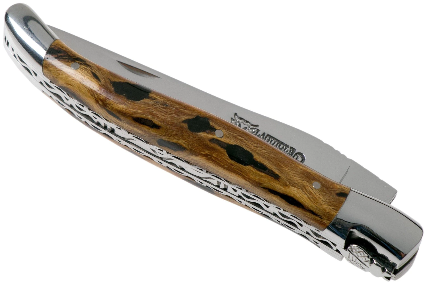 Ce couteau de poche Laguiole en Aubrac 12 cm est l’incarnation de l’élégance. Ce couteau de poche est fabriqué à la main pour assurer une finition raffinée de beaux motifs. Le backspacer et le jimping sont richement décorés. Sur le dessus de la mitre avant, on trouve l’abeille Laguiole typique. Tout cela se fait à la main dans les ateliers Laguiole en Aubrac dans la région française de l’Aubrac. Une particularité est le manche en cactus stabilisé, rempli de résine époxy gris argent. La lame est en acier inoxydable Sandvik 12C27. Les mitres et la lame ont une finition mate. Cela rend le couteau moins sensible aux doigts sales. Le côté de la poignée porte la célèbre croix du berger.