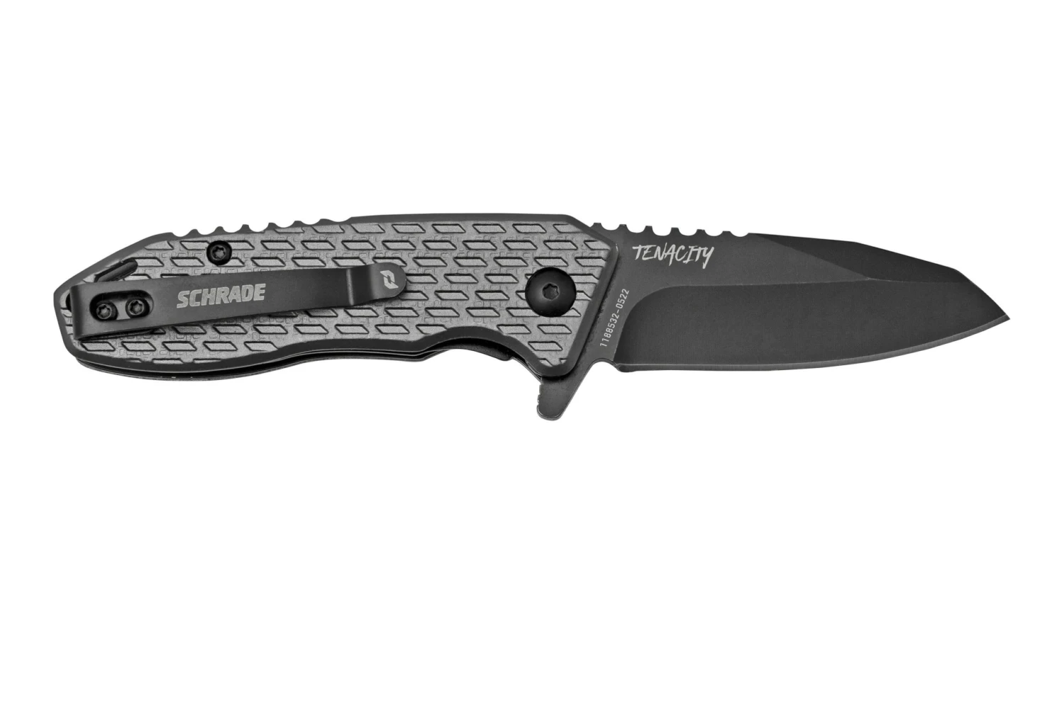 Le Schrade Tenacity est un couteau de poche compact, qui se glisse facilement dans la poche. La lame droppoint est faite en acier AUS10. Un acier japonais robuste et facile à aiguiser. Il conserve également très bien son tranchant. La lame s’ouvre grâce au flipper et un solide linerlock la maintient en position ouverte. Le manche est en aluminium. Ce couteau est donc très léger et on le sent à peine quand on le porte sur soi. Le clip de poche deep-carry permet de porter le couteau bien au fond de la poche.