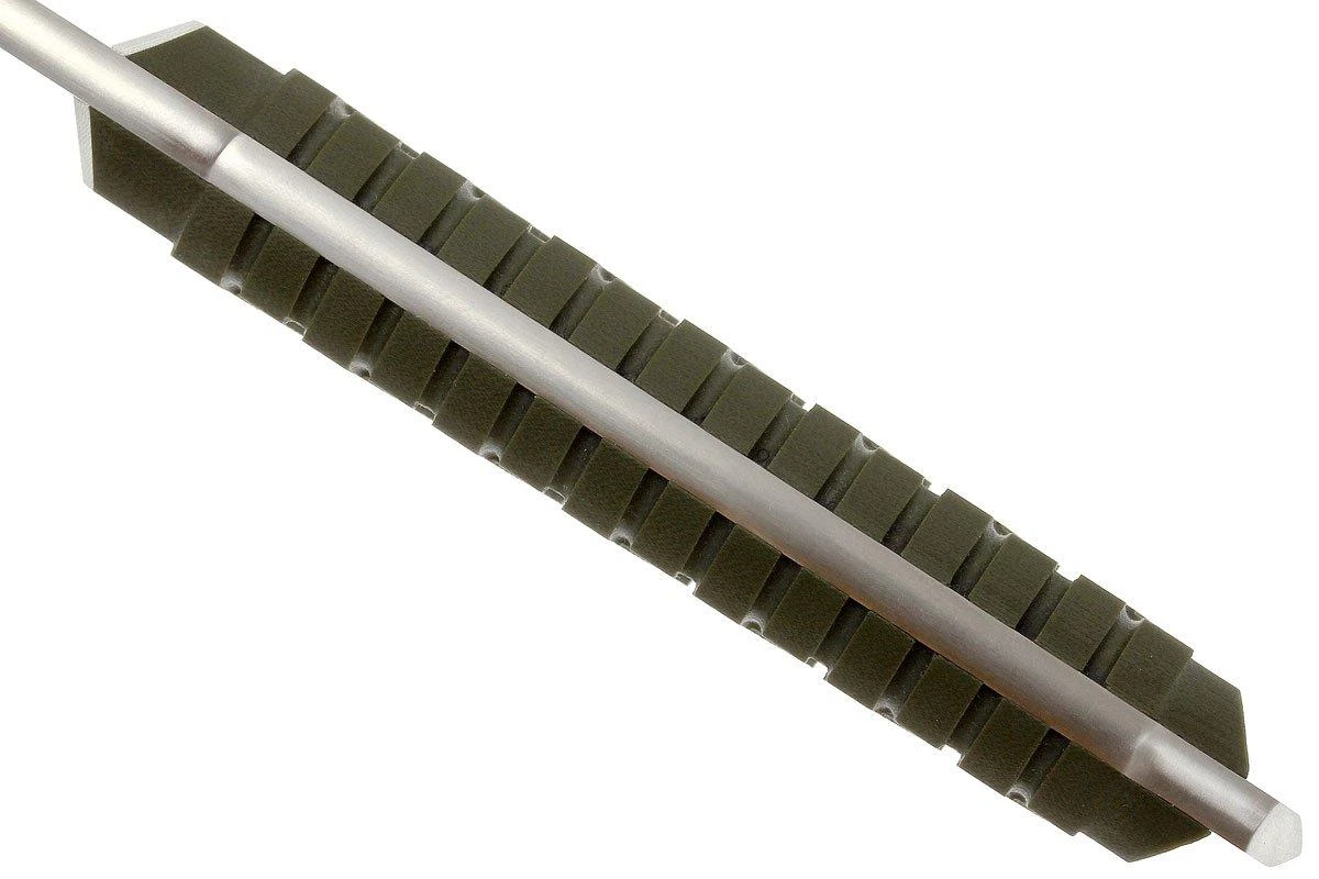 Le Steel Will Courage 311 est un couteau fixe très solide, au look oriental affirmé. On remarque tout de suite que ce couteau tactique est inspiré de la tradition coutelière japonaise ancestrale. Le manche en G10 fraisé est conçu de telle façon qu’il ressemble au manche d’une épée traditionnelle japonaise. C’est pareil pour la lame : on voit immédiatement qu’elle vient du Japon.