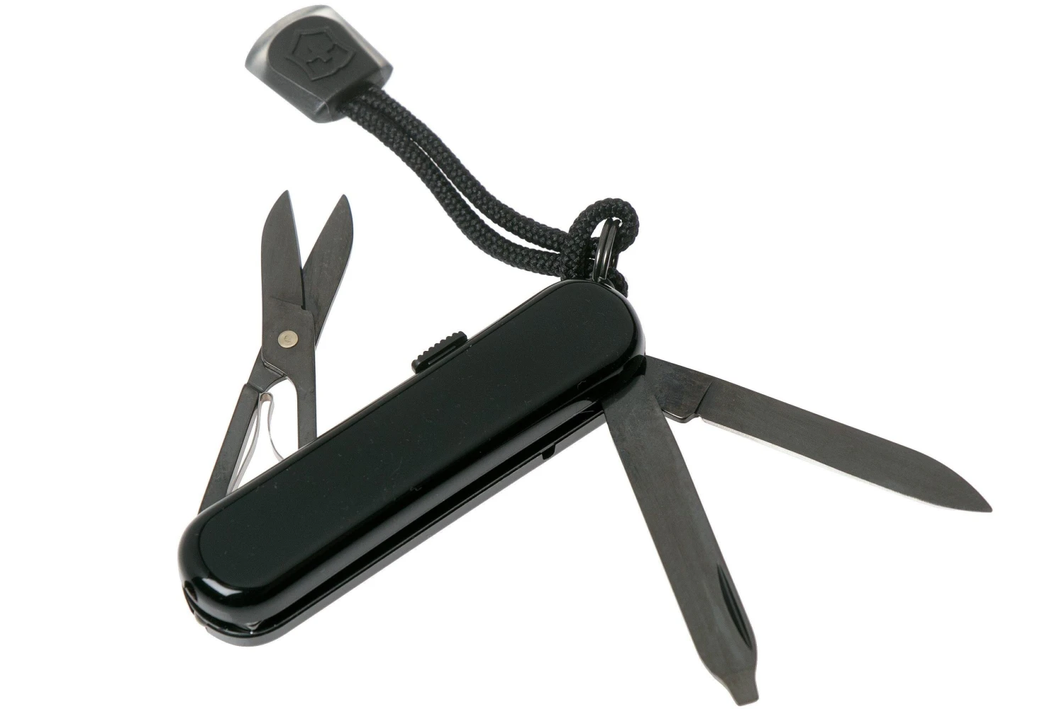 Avec le Victorinox Signature Lite Onyx Black 0.6226.31P plus besoin d’emprunter de stylo. Non seulement ce couteau de poche est doté des outils traditionnels d’un couteau suisse, mais il possède également un stylo à bille et une lampe LED. En plus, le Signature Lite est doté d’un couteau, d’une lame, et d’une règle qui peut faire office de tournevis.